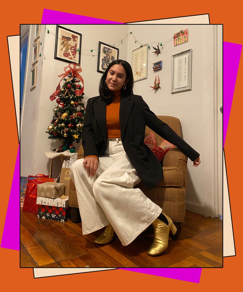 For the undergarment, I chose to wear the look because there is some shimmer to it. The color reminds me of the '70s, so the wide-leg jeans paired with the double-breasted jacket give it a cool aesthetic. To add some holiday cheer, I went to buy the gold stockings that really made the jumpsuit shine. As for the pants, I chose to keep them more casual, pairing them with a white turtleneck and black loafers. However, she did need some holiday pieces, so this black headband was a perfect fit.